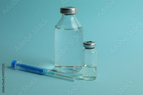 Vials with Covid - 19 vaccine and syringe on blue background