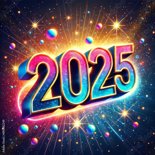 Vibrant 3D 2025 Text Design with Cosmic Background: Glowing Numbers in Gold, Blue, and Pink Surrounded by Sparkles