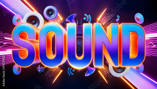 Vibrant 3D 'SOUND' text with audio elements, speakers, and neon light effects.