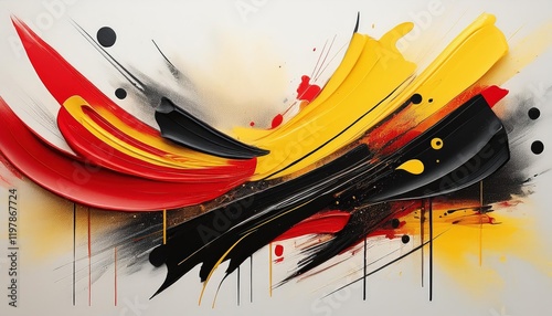 Vibrant Abstract Artwork in Black, Red, and Yellow on White Background Expressive Strokes Create a Striking Contrast and Energy