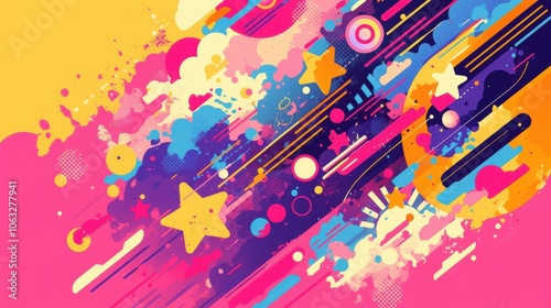 Vibrant abstract artwork with colorful splashes, stars, and geometric shapes on a playful pink background.