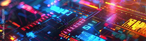 Vibrant abstract close-up of a digital circuit board, showcasing intricate lines and glowing lights for technology themes.