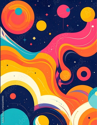 Vibrant abstract design featuring swirling colors and celestial shapes.