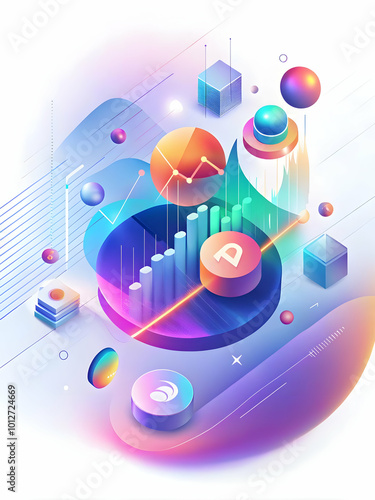 Vibrant Abstract Gradient Background with Holographic Finance Icons: Coins and Charts for Dynamic Financial Marketing