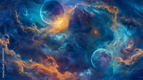 vibrant abstract night sky with floating moons and swirling colorful stars, wide