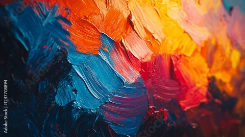 Vibrant abstract oil painting texture with bold strokes of blue, orange, red, and yellow.