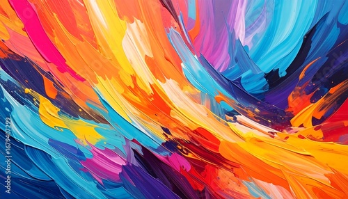 Vibrant abstract painting, showcasing bold strokes of color. Dynamic and energetic composition