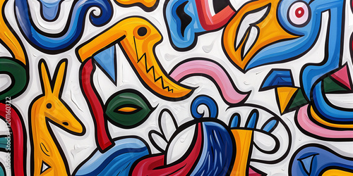 Vibrant Abstract Painting with Whimsical Creatures and Bold Colors
