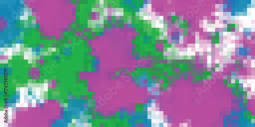 Vibrant abstract pixel art with a chaotic yet harmonious blend of bright pink, green, turquoise, and white squares, creating a dynamic and energetic mosaic effect perfect for modern digital art