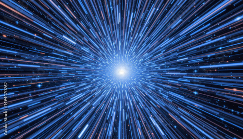Vibrant abstract representation of warp or hyperspace, showcasing dynamic blue and white streaks radiating from central point