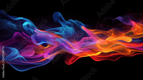 Vibrant abstract smoke waves in blue, pink, orange, and purple colors create mesmerizing visual effect against black background. fluid motion evokes sense of energy and creativity