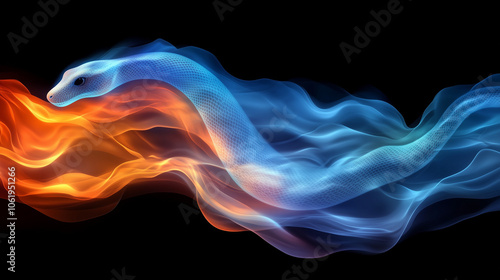 Vibrant abstract snake forms swirling in ethereal colors on a dark background