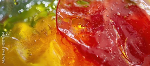 Vibrant abstract texture of colorful gelatin with red yellow and green hues illuminated by light creating a dynamic and fluid composition