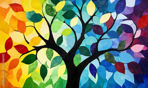 Vibrant Abstract Tree with Multicolored Leaves on Canvas,A vivid abstract painting depicting a tree with colorful leaves arranged in a rainbow gradient.