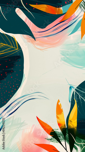 Vibrant abstract tropical leaves background with dynamic brush strokes and vivid colors.