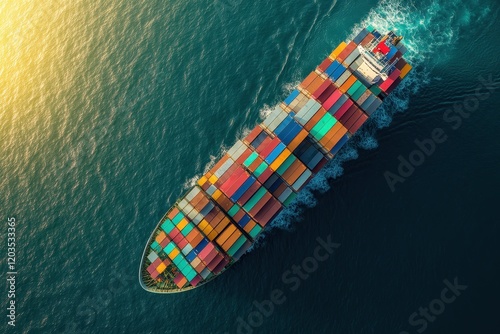 Vibrant Aerial View of Container Ship Navigating Calm Waters with Colorful Cargo Boxes Filled with Goods and Products Under Bright Sunshine