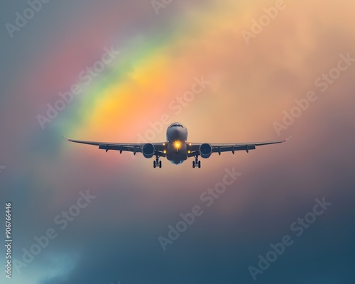 Vibrant Airplane Soaring Through Colorful Rainbow After Storm