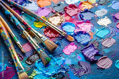 Vibrant and Chaotic: A Detailed Look at an Artist's Paint Palette with Scattered Brushes