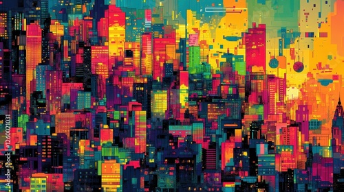 Vibrant and colorful abstract cityscape painting showcases urban landscape