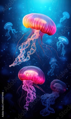 Vibrant and Colorful Jellyfish Swimming Gracefully in a Deep Ocean Environment with Mystical Blue Light
