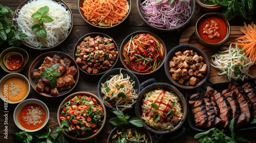 Vibrant and Delicious Thai Feast - Overhead Aerial View of Som Tum, Grilled Meats, and Accompaniments on a Family-Style Table