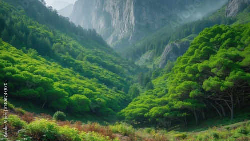 Vibrant and dense pine tree forest thriving on a mountainside.