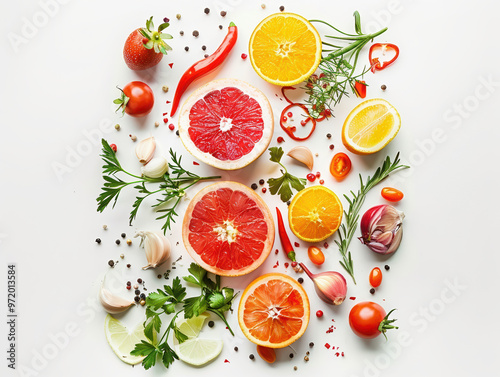 Vibrant and Fresh Fruits and Vegetables: Citrus, Grapefruit, Orange, Lemon, Lime, Tomatoes, Garlic, Chili, and Herbs for Healthy Cooking, Colorful Recipes, and Wellness Nutrition