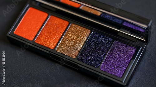 Vibrant and Glittering Eye Shadow Palette with Orange Gold Navy and Purple Colors for Creative Makeup Looks