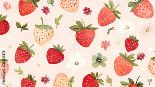 Vibrant and Whimsical Strawberries and Flowers Pattern on Soft Pink Background Perfect for Scrapbooking, Textile Design, and Food-Related Projects
