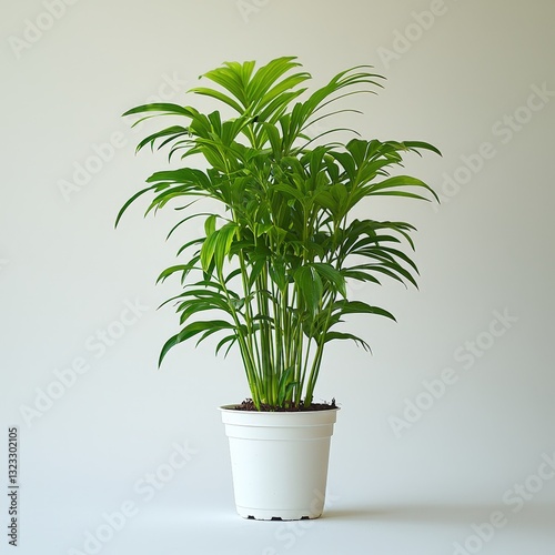 Vibrant areca palm in minimalist white pot on neutral background for modern interiors