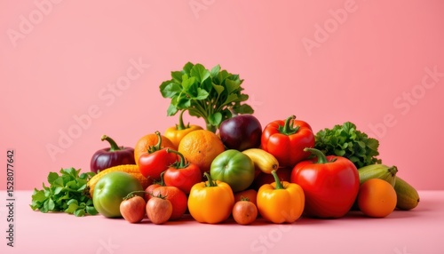Vibrant Arrangement of Fresh Fruits and Vegetables on Pink Background Highlighting Health and Nutrition