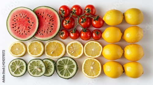 Vibrant arrangement of fresh fruits including watermelon, tomatoes, and lemons on a white background