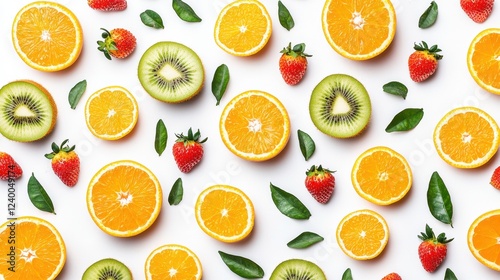 Vibrant Arrangement of Orange Slices, Green Kiwi, Red Strawberries, and Fresh Leaves on White Background