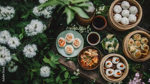 Vibrant Array of Dim Sum Dishes Surrounded by Beautiful Flowers
