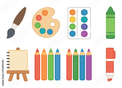 Vibrant art supplies featuring paints, brushes, crayons, and colorful pencils