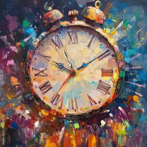Vibrant artistic clock symbolizing time and celebration with abstract strokes