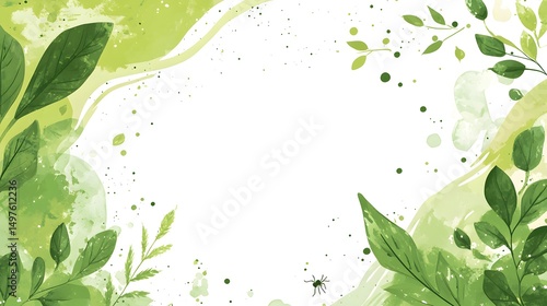 Vibrant, artistic design featuring various shades of green leaves and plants arranged in a frame pattern against a white background.