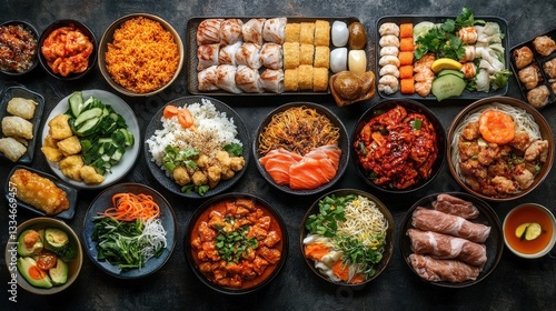 Vibrant Asian cuisine artfully arranged in a circular display. A delicious and colorful feast for the eyes