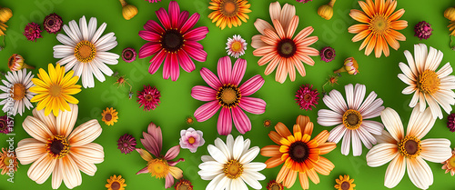 Vibrant assortment of colorful daisy flowers beautifully arranged on a bright green background creating a cheerful and lively floral design.