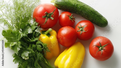 Vibrant assortment of fresh vegetables on white background featuring green herbs, yellow bell peppers, ripe red tomatoes, and dark-green cucumber.