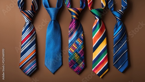 Vibrant assortment of neckties displayed on a brown background showcasing diverse patterns and colors for fashion and accessory themes.