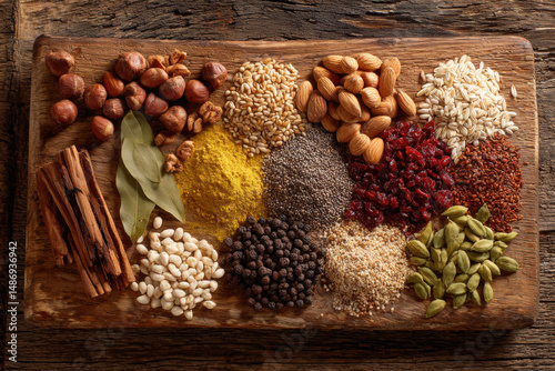 Vibrant assortment of spices and nuts arranged wooden board, showcasing various textures and colors, perfect for culinary