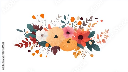 Vibrant autumn floral arrangement featuring pumpkins, leaves, and colorful flowers on a white background during the fall season