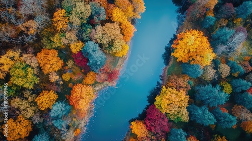 Vibrant Autumn Foliage Surrounding Serene River in Aerial View