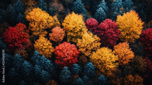 Vibrant autumn forest showcasing colorful foliage with a serene backdrop of green trees
