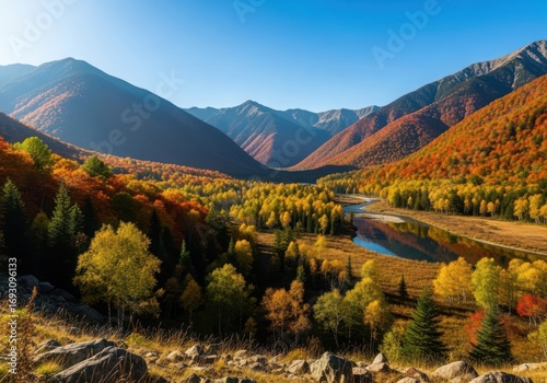 Vibrant autumn forest valley with a winding river reflecting the colorful foliage under a clear blue sky