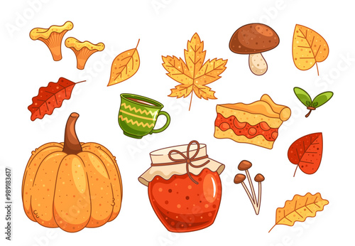 Vibrant Autumn Harvest Elements Including Pumpkin, Leaves, Mushrooms And Seasonal Treats Capture The Essence Of Fall