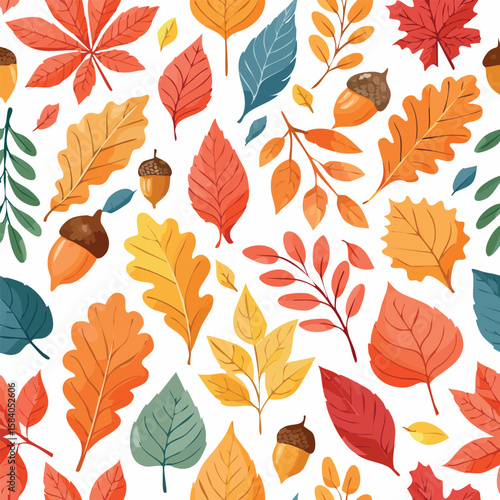 Vibrant autumn leaves and acorns pattern, colorful foliage design.