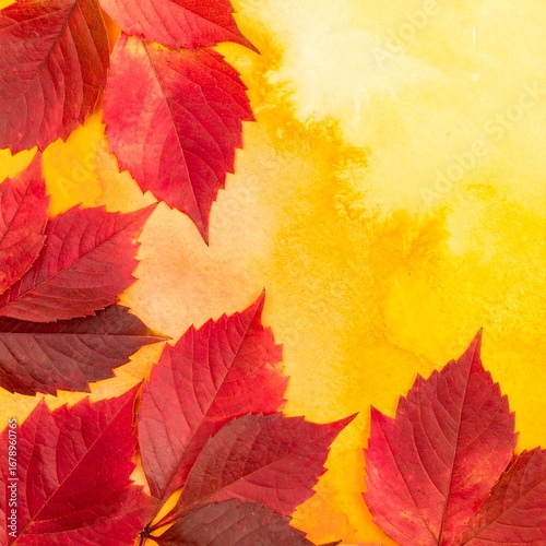 Vibrant autumn leaves arranged artfully against a warm, yellow watercolor background.
