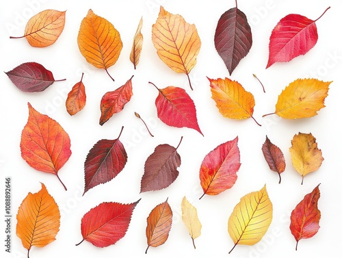 Vibrant Autumn Leaves Collection Flat Lay of Red, Orange, and Yellow Fall Foliage Isolated on White Background